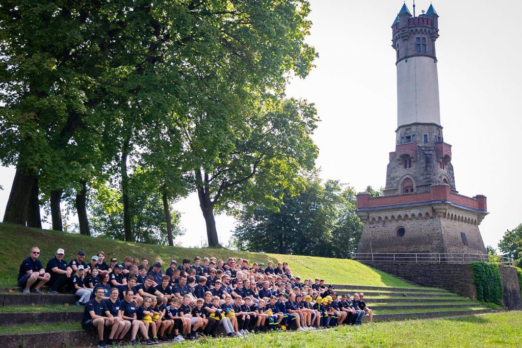 Nach einem Gruppenfoto 📸 am Harkortturm ging es nach einer kurzen Einweisung in die Kletterausrüstung hoch hinauf.